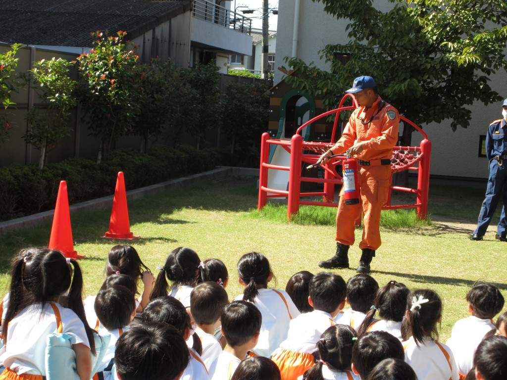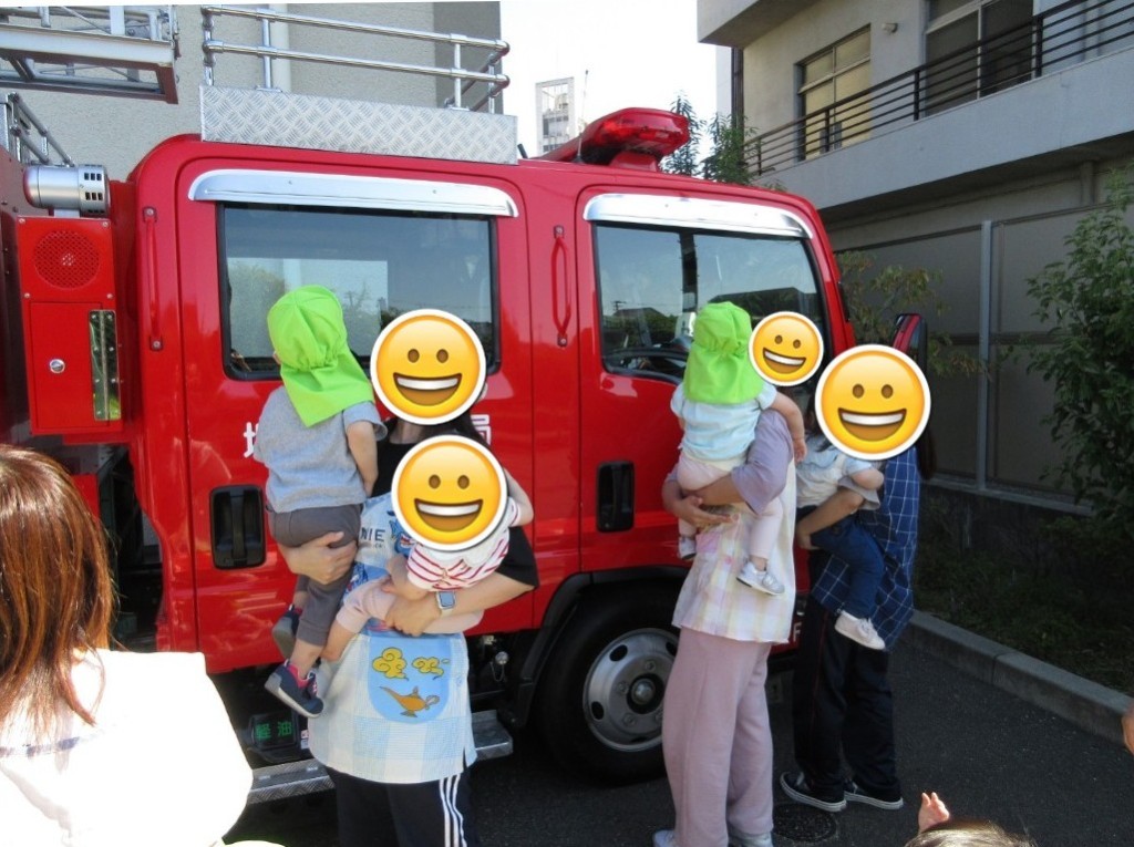 その後は先生たちが水消火器を実践する様子を見て応援したり、消防車を見せてもらって目を輝かせる子ども達でした☆