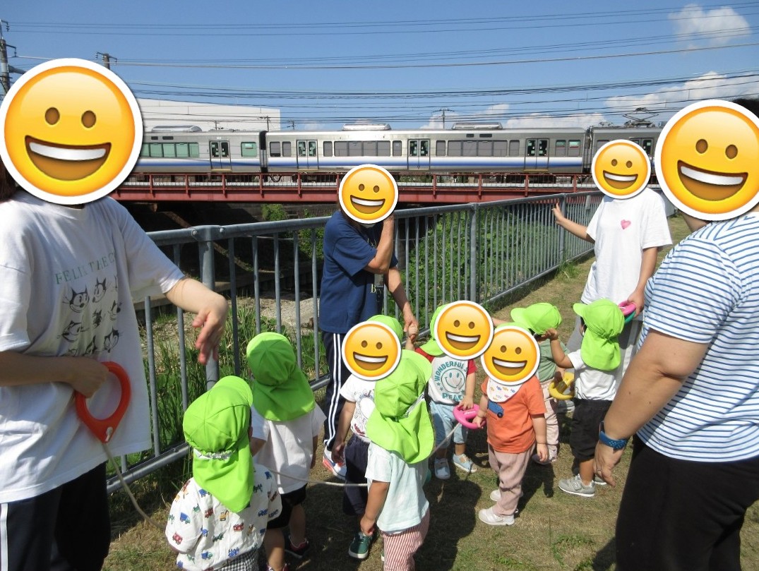 コスモスやいろんなお花を見つけたり、川の流れを見たり、電車が走っていく様子を見たり大忙し!