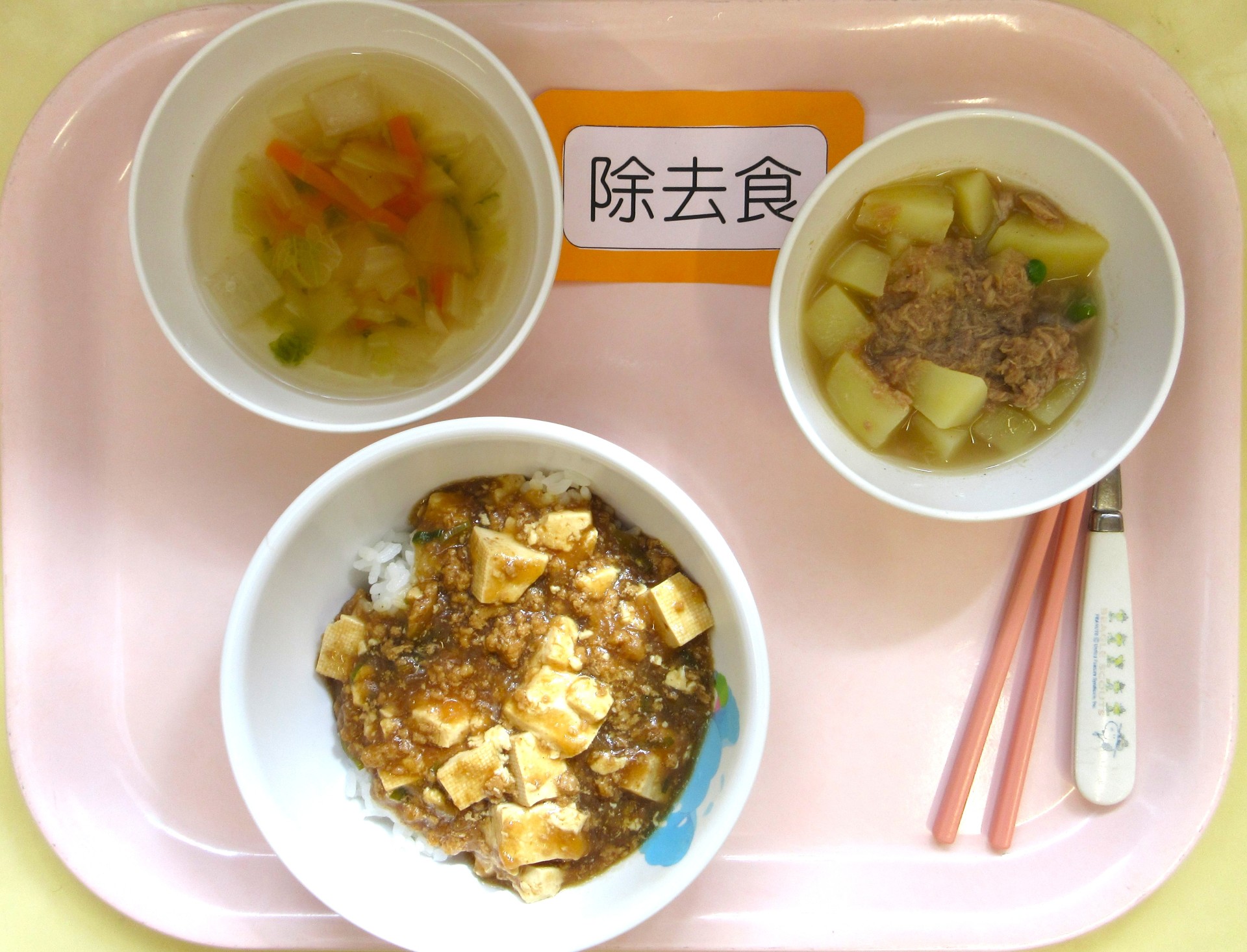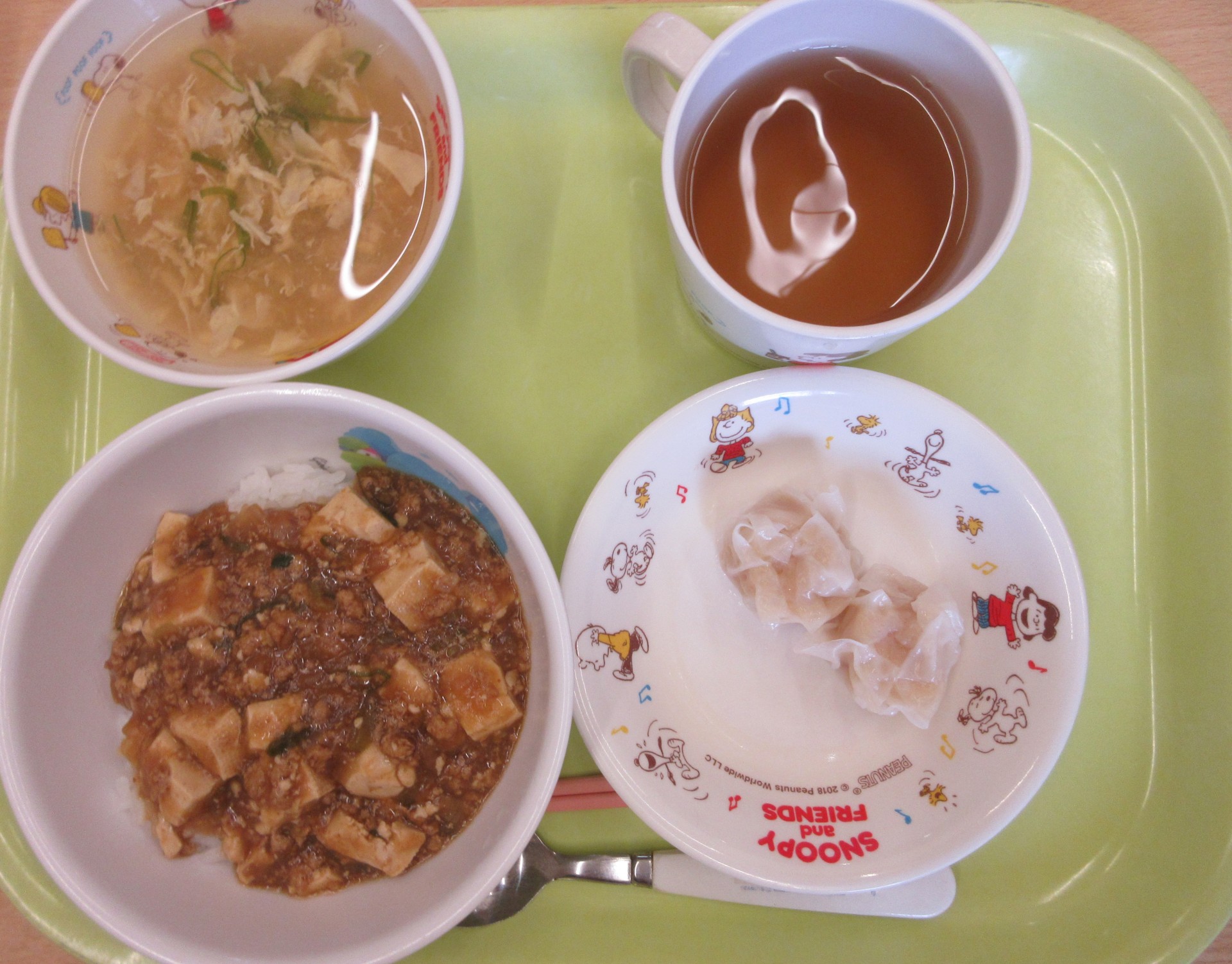 本日の給食をお知らせします。 〇マーボー豆腐丼 〇蒸ししゅうまい 〇かきたま汁
