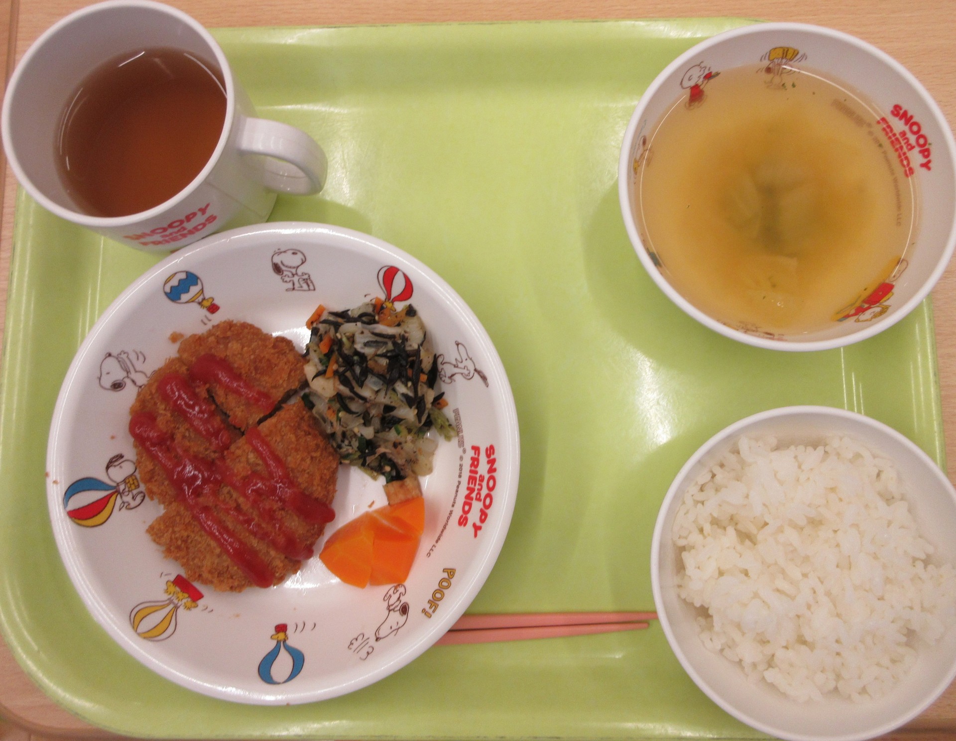 本日の給食をお知らせします。 〇ご飯 〇メンチカツ 〇ひじきサラダ 〇コンソメスープ(白菜)
