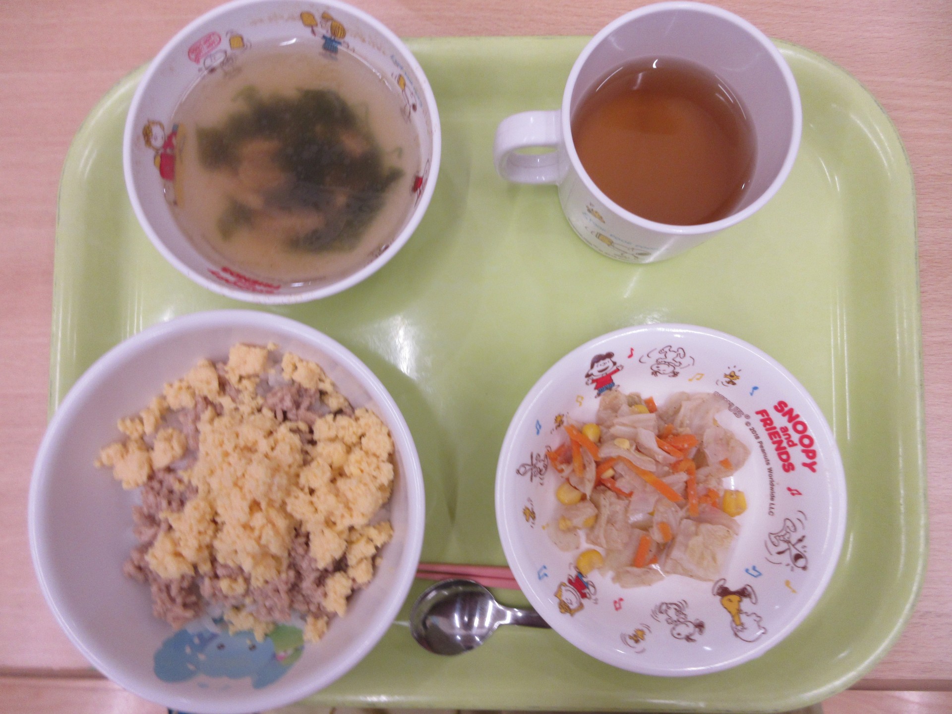本日の給食をお知らせします。 〇二色丼 〇キャベツとコーンのごま和え 〇清汁(わかめ・油揚げ)