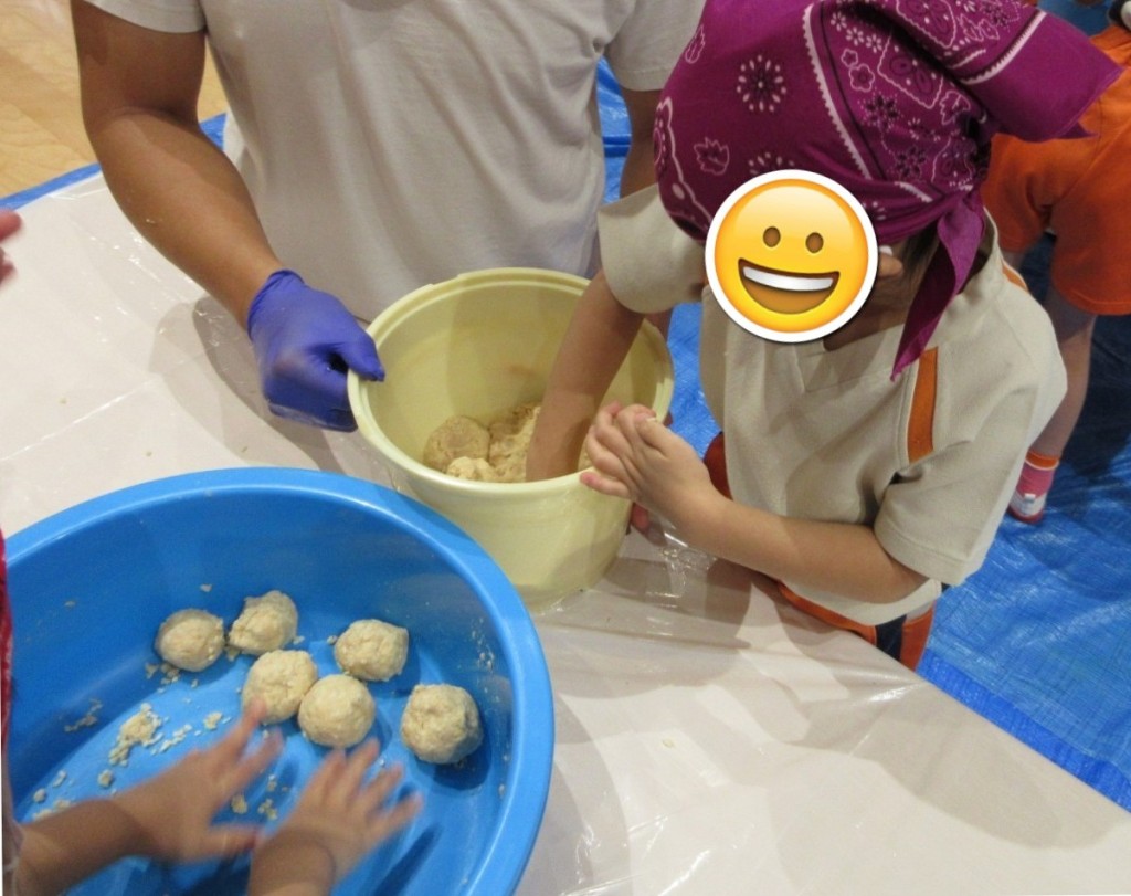 お友だちと協力して沢山捏ねたり、丸めたり、詰め込んだり!